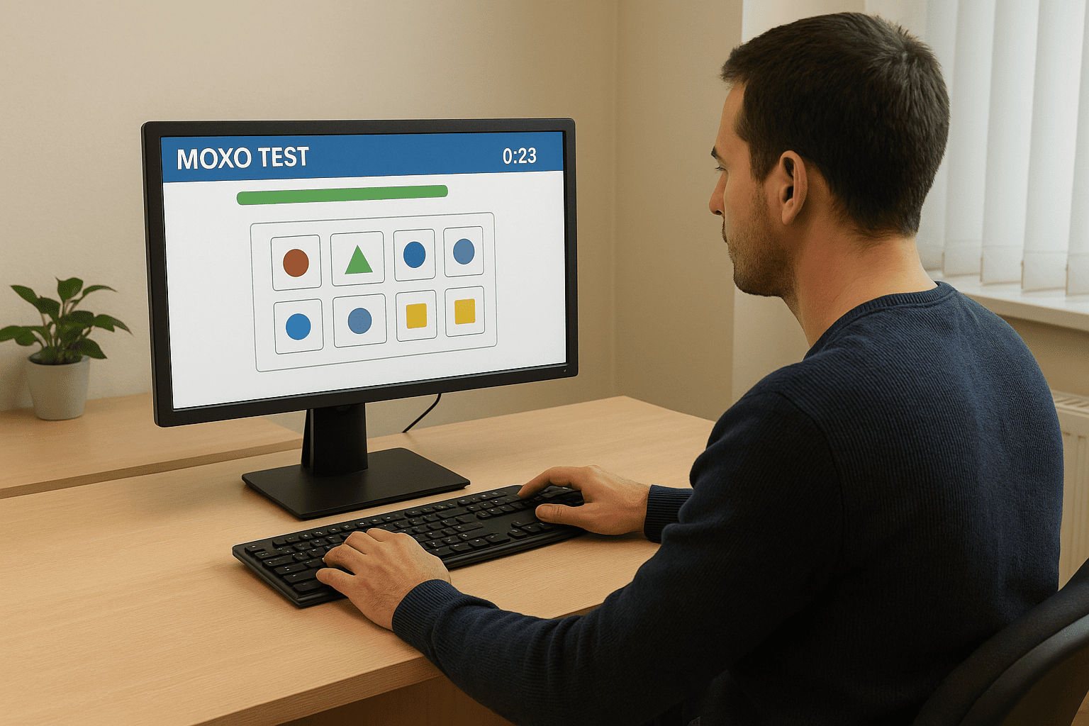 El MOXO es una prueba de rendimiento continuo (CPT) diseñada para adultos (y adolescentes) que analiza la atención, impulsividad, tiempo de respuesta e hiperactividad en situaciones similares a la vida real. Durante aproximadamente 18–20 minutos.